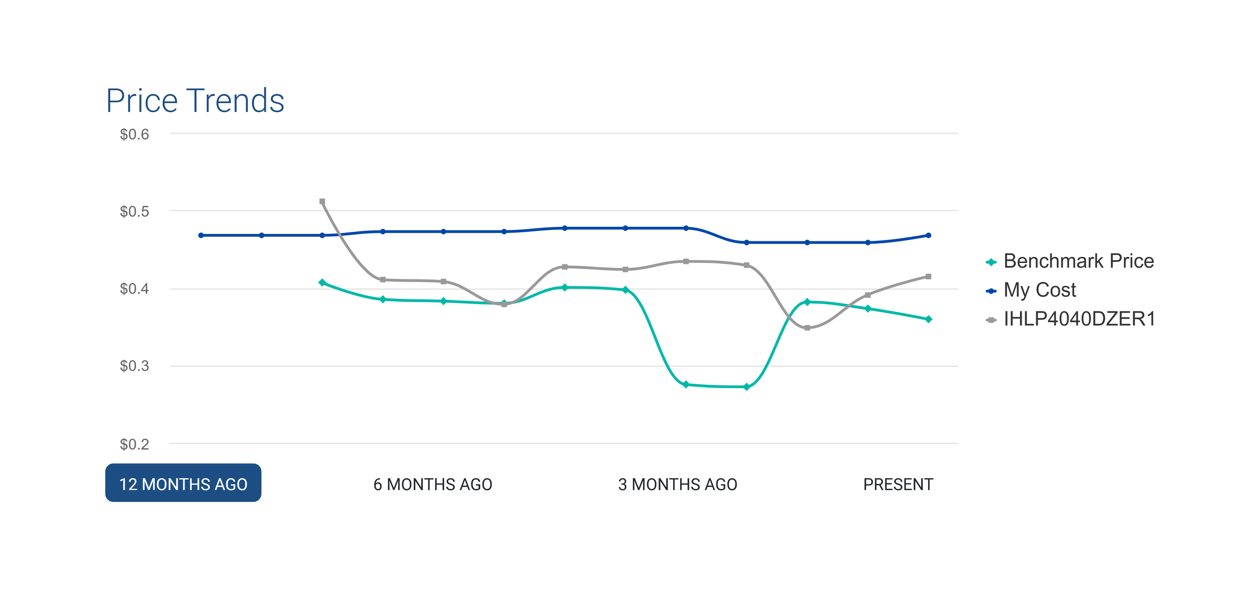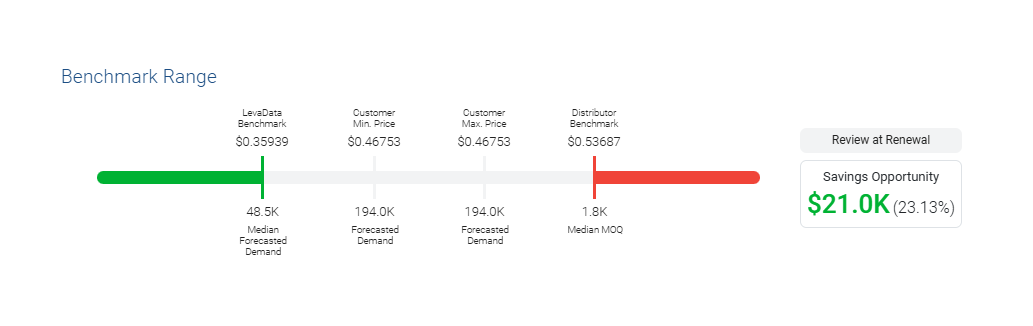 The benchmark range bar shows your price vs. distributor and contract market price bands. It helps you explain where you are today and discover the next level that’s realistic for your performance—so savings follow naturally.